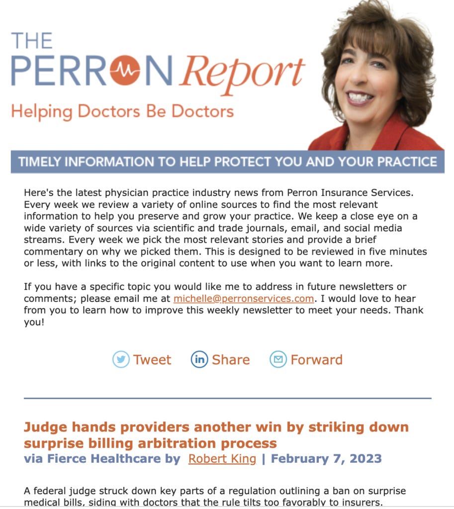 After some market analysis, we determined that a curated newsletter would be a perfect fit. Michelle could summarize important legislative and legal trends to keep doctors up to date and save them hours of reading. At the same time, this activity was congruent with her business. Here's an example of her work, truncated, of course: